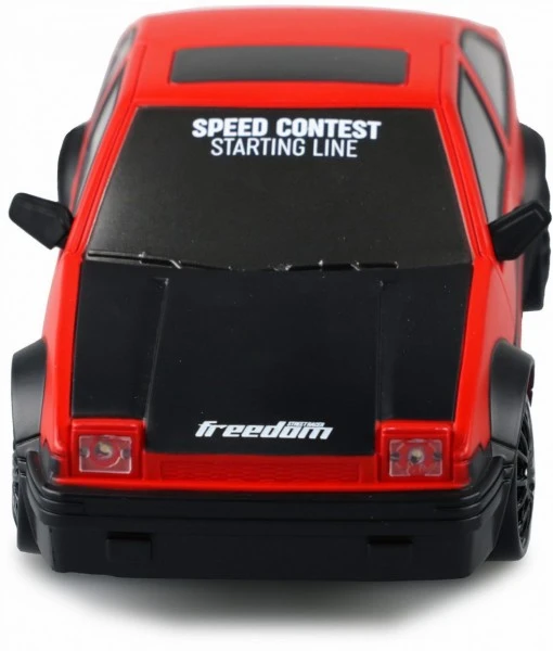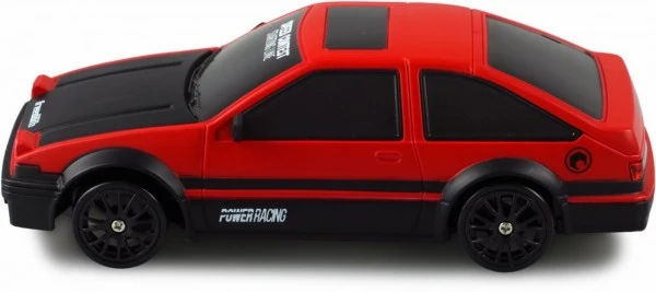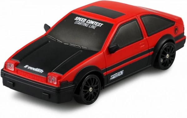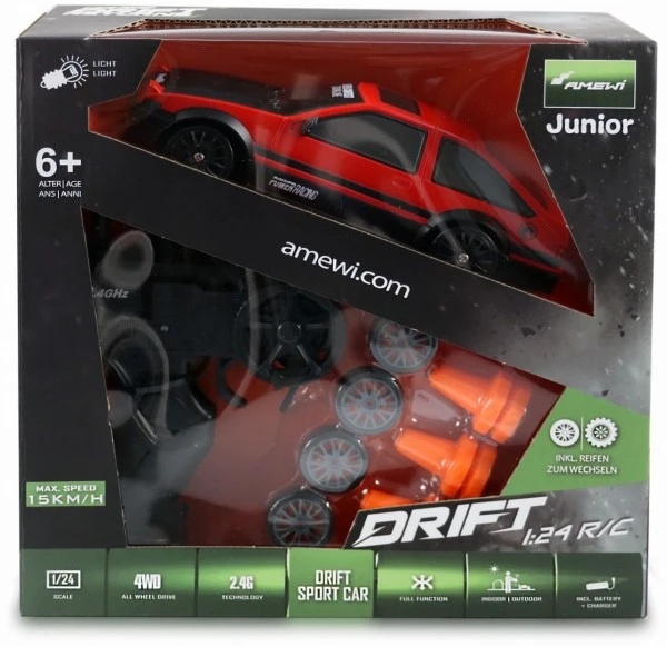 Modell einer japanischen Drift Ikone im Maßstab 1:24 als RTR Modell. Die montierten Drift Reifen erlauben extreme Driftwinkel auf jedem glatten Untergrund und die Front LED Belechtung unterstreicht den sportlichen Charakter des Modells zusätzlich. Ebenfalls im Lieferumfang sind 4 Gummireifen inkl. Felgen für coole Rennaction auf engstem Raum. Drifte mit deinen Freunden um die mitgelieferten Pylonen oder rase mit den Gummireifen präzise um jedes Hindernis. Egal was Du machst, Spaß ist mit diesem tollen Set garantiert und durch das 2,4GHz Übertragungssystem kannst Du auch gleichzeitig mit mehreren Freunden fahren.