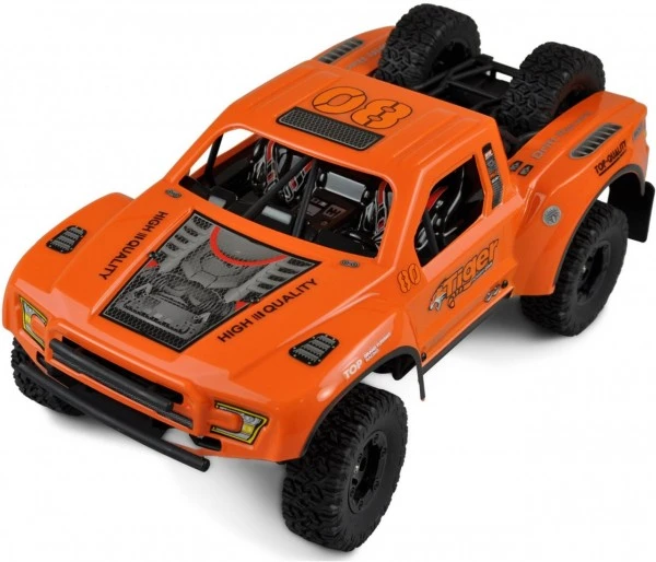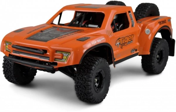 Dieser Short Course Truck im Maßstab 1:12 ist ein absolutes „Sahnestück“ in seiner Klasse. Schnell, robust, RTR und Top verarbeitet. Das sind nur einige Merkmale dieses super schönen Modells. Die ganze Verarbeitung ist sehr hoch- wertig und die Karosse ist aus schlagfestem ABS mit einer sehr guten Oberflächen Qualität. Der Hochleistungsmotor beschleunigt diesen Racer auf bis zu 40 km/h und die gut in der Hand liegende 2,4GHz Steuerung mit Dualratenfunktion für Gas (Höchstgeschwindigkeit einstellbar) lässt sie nie die Kontrolle verlieren. Die High Grip Reifen bieten zu dem Traktion auf jedem Untergrund. Die Spritzwassergeschützte Elektronik tut ihr übriges um hohen Fahrspaß zu gewährleisten! Der Sender verfügt als weiteres Highlight über ein Lenkrad, welches sich „durch“ den Sender drücken lässt. So wird aus einem rechts gelenkten Modell im Handumdrehen ein Linkslenker. Somit ist das Modell aus der Box ohne Umbau für Rechts und Linkshänder gleichermaßen geeignet.