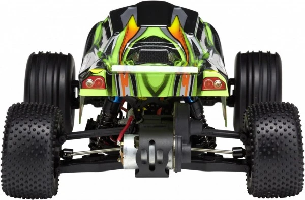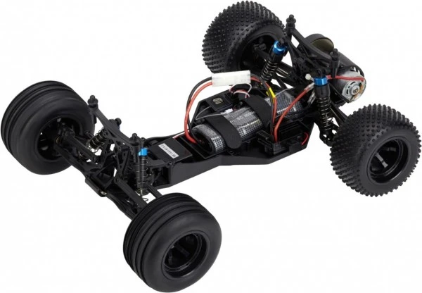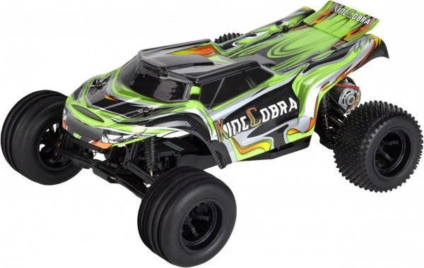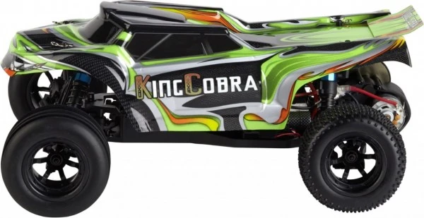 Mit dem Truggy von Bernstein machen Sie sowohl Offroad, als auch Onroad eine gute Figur. Durch seine Spike Reifen auf der Antriebsachse, hat er auch in unwegsamen Gelände perfekten Grip. Auf der Vorderachse finden wir glatte Reifen, mit denen auch wunderbar auf Asphalt navigiert werden kann. Die Karosserie des King Cobra Truggy wurde neu überarbeitet und ist nun noch stabiler. Dadurch steckt er so manchen Stunt locker weg. Das Set ist RTR – sie können also direkt loslegen, da der Truggy komplett vormontiert ist. Ebenfalls enthalten ist eine proportionale Pistolenfernbedienung, welche mit neuster 2.4 GHz Funkübertragungstechnologie ausgestattet ist. Dadurch ist ein störungsfreier Betrieb der Funkanlage sicher gestellt. Auch enthalten ist ein passender Akku mit passendem Ladegerät. Damit haben Sie alles was sie brauchen, um tollen Fahrspaß zu erleben.