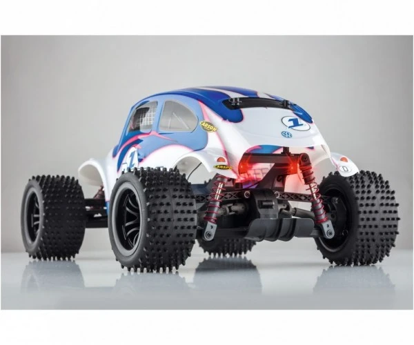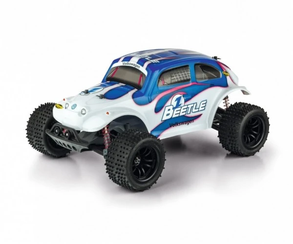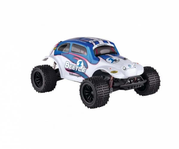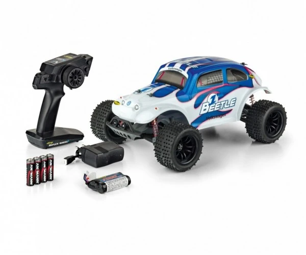 Der Beetle, ist der bis zu 35 km/h schnelle, offiziell von Volkswagen lizensierte, Off-Road Truggy aus der Fast-Entry Linie von CARSON Modelsport. Mit seiner störungsfreien 2,4 GHz Fernsteuerung und dem neu konzipierten, 4-fach gefederten Chassis, ist er der Truggy für unwegsames Gelände. Die Hinterräder werden über Kardangelenke angetrieben. Eine spritzwassergeschützte Elektronik erlaubt auch Fahrten auf feuchtem Untergrund. Der Blickfang ist die aufwendig gestaltete Karosserie, die LED-Scheinwerfer erleichtern das Fahren bei Dämmerung. Griffige Off-Road-Pinreifen verleihen dem Hecktriebler in allen Lagen ausreichend Gripp. Ein High Power LiIon-Fahrakku mit Schnell-Ladegerät sorgt für langanhaltenden Fahrspaß. Der Akku lässt sich von unten in dem Modell befestigen und macht so das Entfernen der Karosserie überflüssig. Alles für den Betrieb Notwendige ist im Lieferumfang enthalten – Kaufen, Laden, Fahren! Start your race!