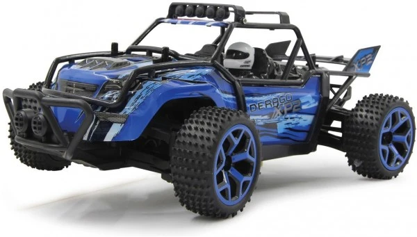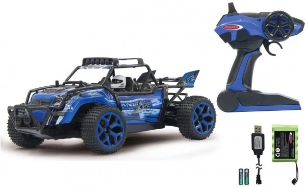 Der Derago von Jamara wird alle Modellbaueranfänger und Profis gleichermaßen begeistern. Ein kraftvoller Motor und ein tolles, extravagantes Design mit stabilem Überrollbügel machen diesen RTR Buggy zum Hit auf jeder Rennpiste. Gummireifen für optimalen Gripp, proportionaler Fahrtenregler und einstellbarer Spurlauf für coole Drifts sprechen die klare Sprache eines kleinen Geländetruggys und das bei einer Größe einem DIN A4 Blatt. Der Lieferumfang ist RTR das heißt alles dabei was sie zum losfahren brauchen. 2,4 GHz Funkfernsteuerung mit hoher Reichweite und leistungsstarker Akku mit USB Ladekabel, machen den Fahrspaß komplett.