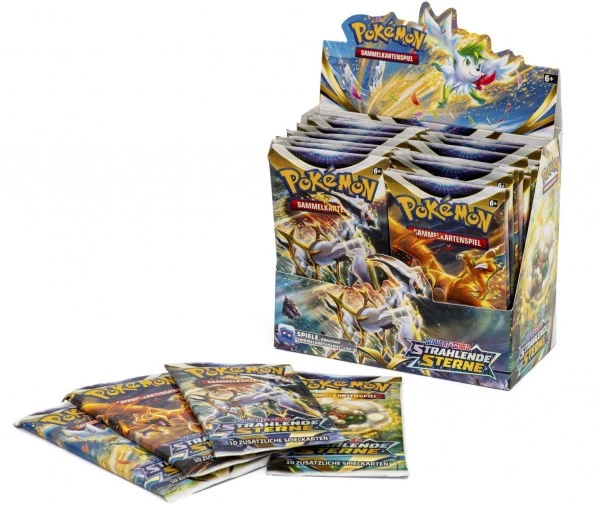 Von Licht erfüllt sinkt Arceus-VSTAR herab, um seine überirdischen Kräfte mit anderen Pokémon-V zu teilen. Shaymin-VSTAR, Glurak-VSTAR und Elfun-VSTAR verfügen über sagenhafte neue VSTAR-Powers, während Mimigma-VMAX, Stolloss-VMAX und Kingler-VMAX in seiner Gigadynamax-Form mit eigenen gewaltigen Kräften antreten. Entdecke funkelnde Konstellationen und begib dich auf den Weg zu astronomischer Größe mit der Pokémon-Sammelkartenspiel-Erweiterung Schwert & Schild – Strahlende Sterne!
