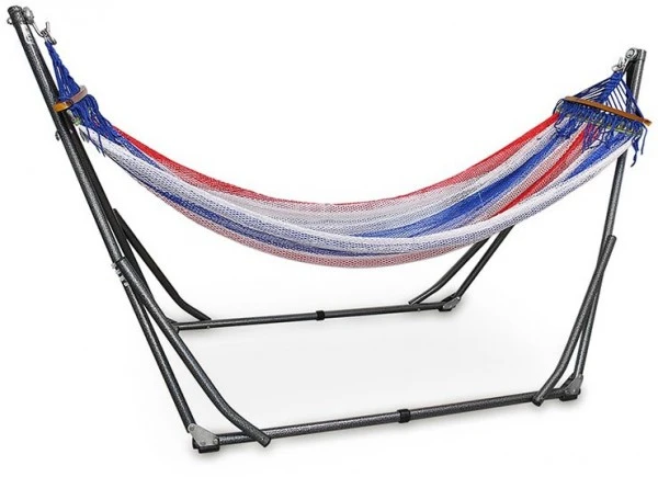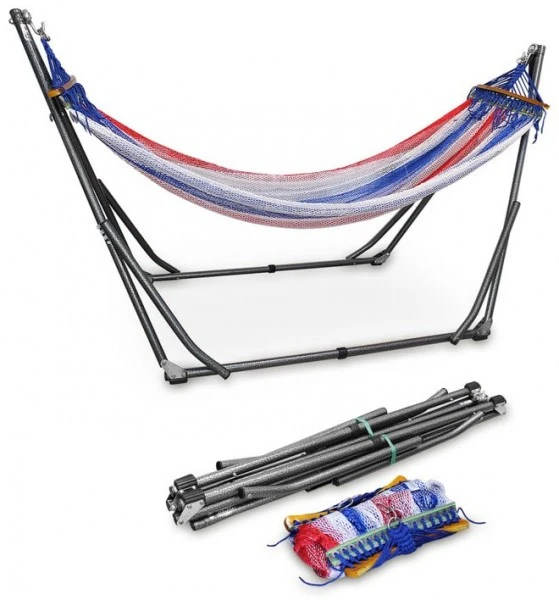 Mit dieser praktischen Stand-Hängematte können Sie nun immer und überall entspannen. Das faltbare Metallgestell ist unabhängig von jeglichen Bäumen oder Befestigungen und kann daher umgebungsunabhängig aufgestellt werden.