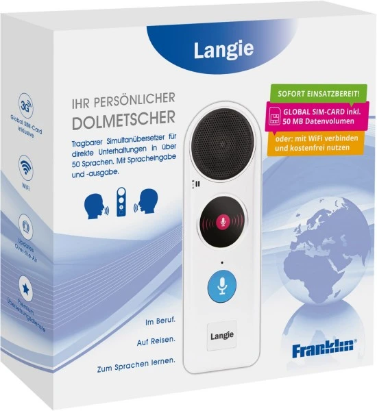 Ihr LANGIE begleitet Sie überall hin und sorgt dafür, dass Sie auf der ganzen Welt sofort und fließend mit den Menschen vor Ort sprechen können. Keine Texteingabe oder kompliziertes Suchen nach passenden Wörtern oder Phrasen mehr. Das handliche Gerät passt in jede Handtasche und verfügt über unglaubliche 53 Sprachen – über 40 davon mit Sprachausgabe. Im Lieferumfang enthalten ist eine GLOBAL SIM-KARTE inkl. 50MB Datenvolumen, damit Sie sofort loslegen können! In über 130 Ländern haben Sie besten 3G Empfang und können Sie so die Vorzüge des mobilen Online-Translators überall nutzen. Das Guthaben können Sie jederzeit bequem online aufladen. Wahlweise können Sie Ihren LANGIE mit dem W-LAN oder unterwegs mit dem Hotspot am Smartphone verbinden. So verbrauchen Sie kein Guthaben auf der SIM-KARTE. Sprechen Sie einfach einen Satz auf, während Sie die Sprachtaste gedrückt halten. Prompt gibt Ihr LANGIE die Übersetzung gesprochen aus! Lassen Sie Ihr Gegenüber nun eine Antwort in seiner Muttersprache sprechen und hören Sie sich die deutsche Übersetzung an. Zur Kontrolle zeigt das Display gleichzeitig den aufgenommen und übersetzten Text an. So führen Sie flüssige Unterhaltungen in vielen verschiedenen Ländern und Sprachen. Ein Knopfdruck genügt! Die Übersetzungsdienste des LANGIE werden permanent verbessert und erweitert. Sie sind Cloud-Basiert und nutzen die fortschrittlichsten Premium-Technologien wie AI (= Artificial Intelligence) und ML (= Machine Learning) eines der größten Softwarehersteller der Welt. Ihr Langie ist damit immer auf dem aktuellsten Stand der weltweiten Übersetzungstechnologie. Regelmäßige Updates für das Gerät selbst erhalten Sie direkt (over the air) auf Ihren LANGIE. Die Aktualisierung erfolgt automatisch.