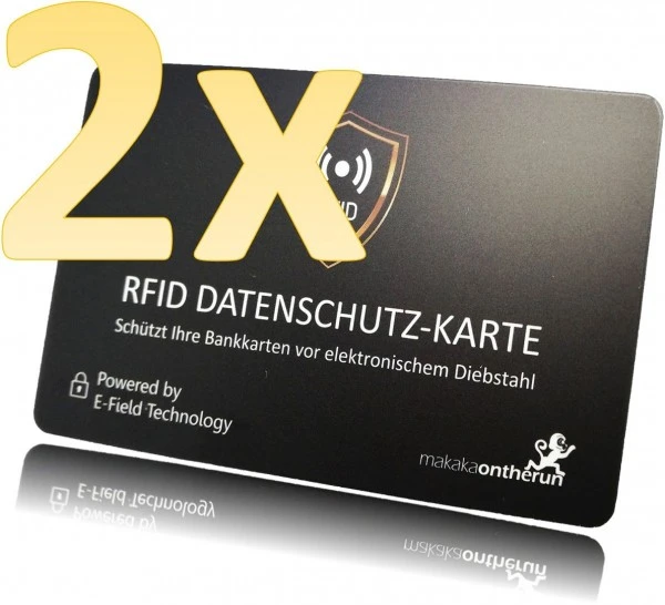 Kontaktloses Bezahlen erfolgt per NFC (Nahfeld-Kommunikation per elektromagnetischem Feld) erlaubt Betrügern mit Karten-Lesegeräten, RFID-Scanner, NFC Card Reader und sogar mit dem Handy / Smartphone Kartennummern und Gültigkeitsdatum auszulesen und damit mit falscher Identität sehr oft auch ohne Sicherheitscode online zu shoppen. Eine einzige MakakaOnTheRun Datenschutzkarte reicht, da sie ein Schutzfeld erzeugt und die Kommunikation zwischen Kartenleser und Karte verhindert.