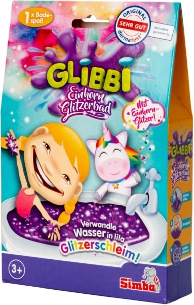 Einhornmagie! Mit dem Glibbi Einhorn Glitzerbad können Mädchen jetzt in lila Schleim mit wunderschönem Einhorn-Glitzer baden. Das Glibbi Pulver verwandelt das Badewasser in tollen lila Glitzerschleim und sorgt für jede Menge Spaß in der Badewanne. Nach dem Badevergnügen wird der Schleim mit viel Wasser verdünnt und abgelassen.